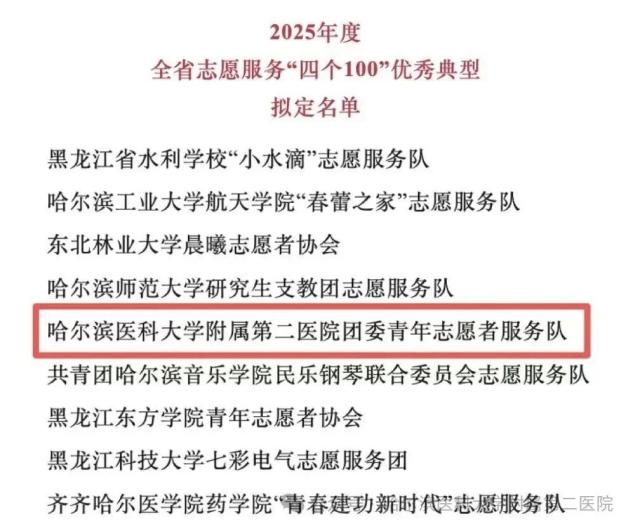 志愿践初心,服务暖龙江近日,在省委社会工作部组织开展的2025年度全省志愿服务“四个100”优秀典型学习宣传活动,由共青团黑龙江省委员会、黑龙江省青年志愿者协会举办的“第八届黑龙江省青年志愿服务项目大赛”和由省委社会工作部、省委宣传部(省文明办)组织开展的“第四届黑龙江省新时代文明实践志愿服务项目大赛”中,哈医大二院喜获多项荣誉。01,2025年度全省志愿服务“四个100”优秀典型在“四个100”优秀典型评选中,...