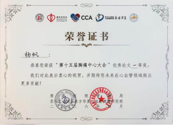 近日,由国家放射与治疗临床医学研究中心、香港医院管理局、苏州工业园区东方华夏心血管健康研究院、广东省胸痛中心协会联合主办的“第十五届胸痛中心大会”召开。在优秀论文交流专场中,哈尔滨医科大学附属第二医院(以下简称“哈医大二院”)心内科杨帆副研究员、贤惠敏主治医师撰写的《QFR指导下血运重建对STEMI多支病变合并CKD患者临床结局的影响》经现场汇报答辩和专家严格评审,斩获“第十五届胸痛中心大会优秀论文一等奖”。