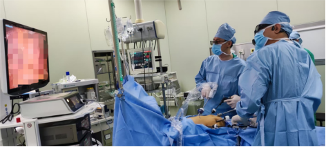高峰教授和李强教授正在为病人实施腹腔镜手术
