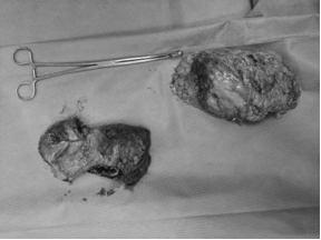 手术切下的直肠肿瘤(左)和右肾肿瘤(右)