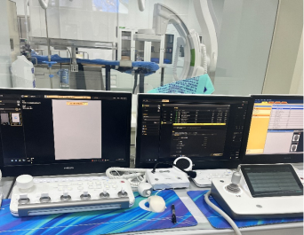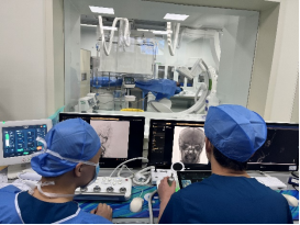 李永利教授带领团队正在远程操控导丝导管到达指定血管及位置,大大减少患者及医生接受辐射的时间