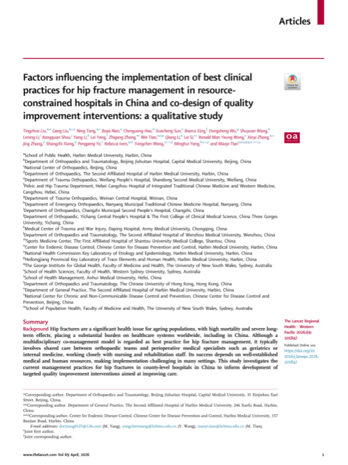 在人口老龄化日趋严重的背景下,老年髋部骨折因高致残、高死亡率成为老年健康的重大威胁。近日,由首都医科大学附属北京积水潭医院、哈尔滨医科大学及哈尔滨医科大学附属第二医院(以下简称“哈医大二院”)等多家医疗机构联合开展的系统性研究成果,发表于国际权威期刊《柳叶刀区域健康(西太平洋)》。该研究聚焦我国县区级医院老年髋部骨折管理现状,为破解基层救治难题、推动优质医疗资源下沉给出了贴合实际的循证方案。