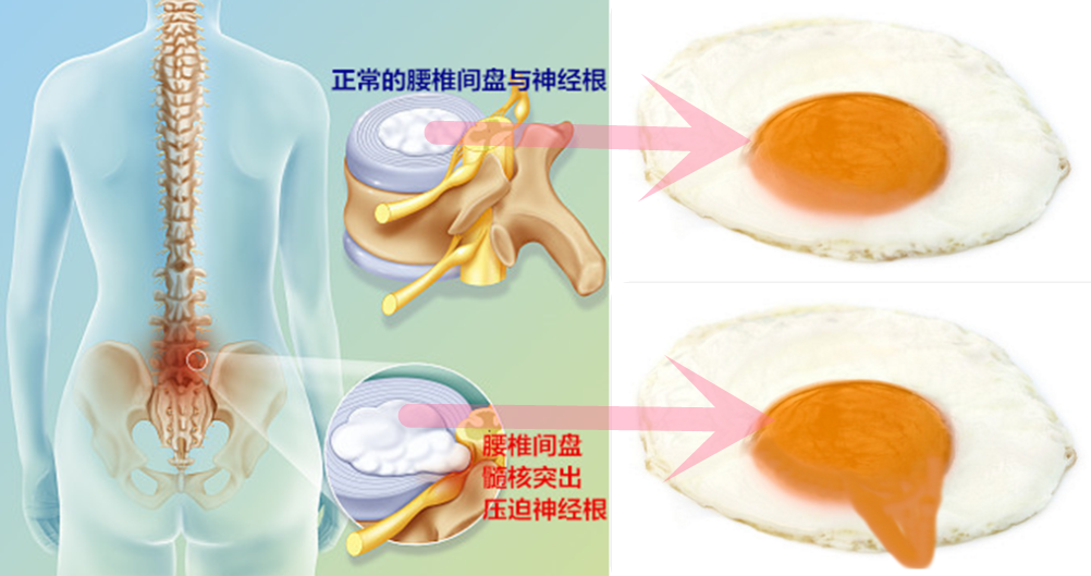 腰椎间盘的结构特点是后方相对薄弱,这样,腰椎在退变老化或经受外力以后,椎间盘的纤维环后方后方会逐渐变脆弱,髓核就会向后方将这个脆弱的部分顶出一个“突出的鼓包”,虽然此时后方的纤维环没有破裂,但这个“突出的鼓包”就会卡压到后方的神经根;再严重一点就是纤维环自后方破裂,中央的髓核将会从破裂的纤维环处突破出来,就像破坏了煎蛋后方的蛋清,蛋黄从破裂处流出来了一样(如图)。