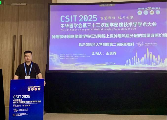 王奕乔主管技师则围绕“肿瘤微环境影像组学特征对胸腺上皮肿瘤风险分层的增量诊断价值” 展开探讨。他系统介绍了医学影像大数据的收集、整理与分析方法,深入剖析了如何借助大数据为临床决策提供精准支持,为推动医学影像技术与临床实践的深度融合提供了全新思路。