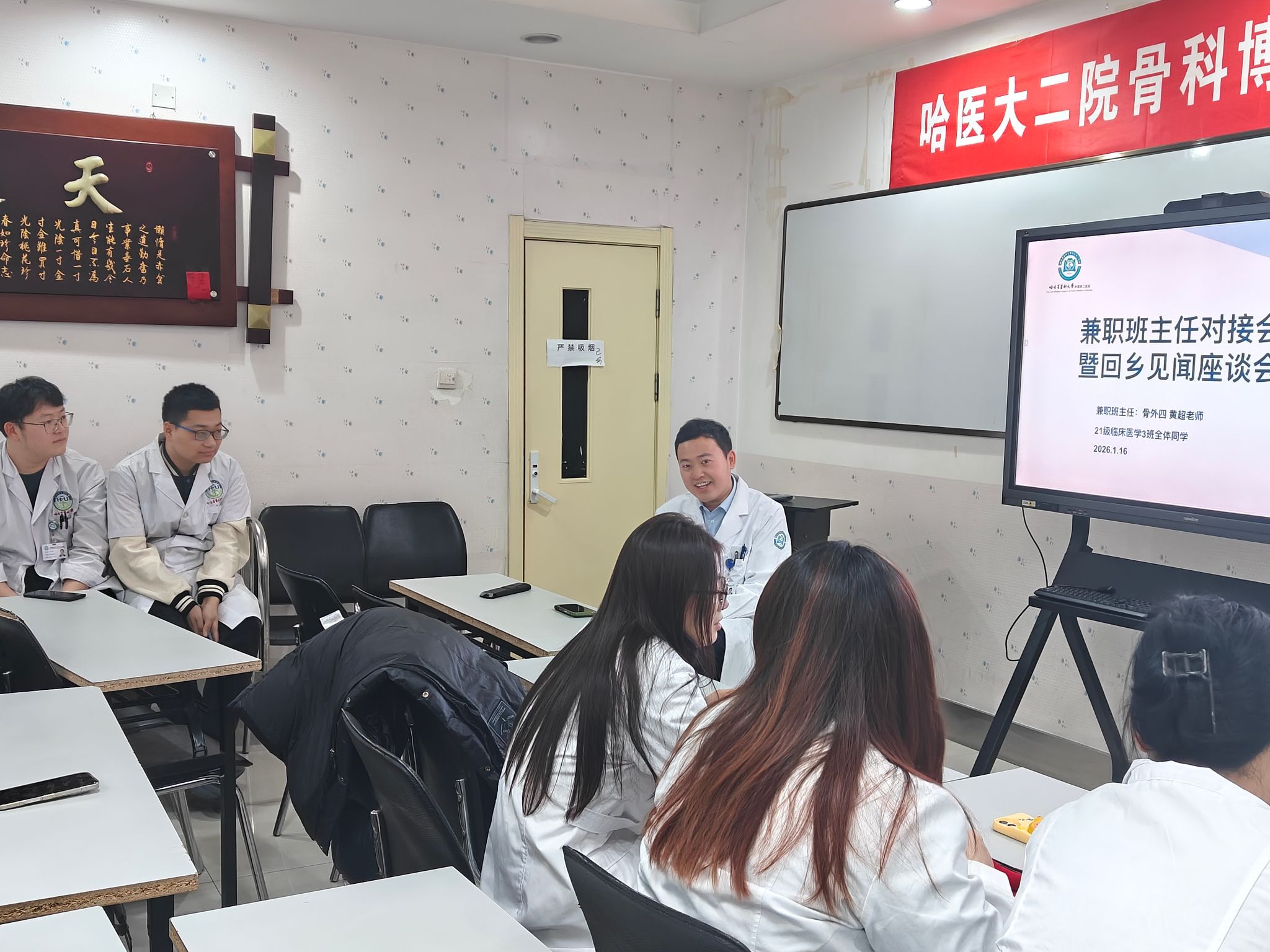 2026年1月16日,第八住院部骨外四病房示教室内暖意融融,2021级临床医学三班兼职班主任对接座谈会在此温馨召开。在兼职班主任骨外四病房黄超老师的悉心引领下,畅谈假期感悟、共话学业规划、展望职业未来。现场既有思想的碰撞,亦有情感的共鸣,充分展现了新时代医学生朝气蓬勃、勇于担当的精神风貌。