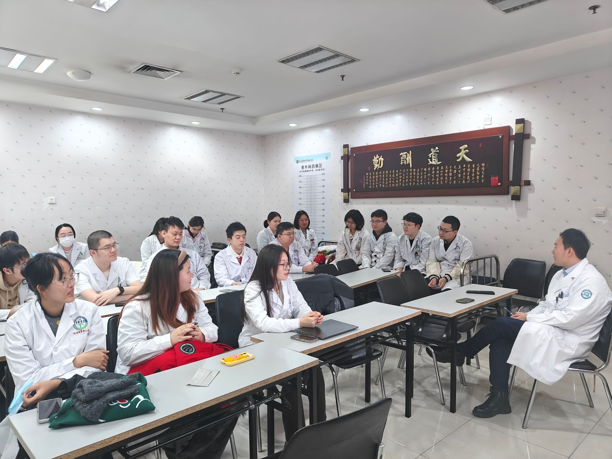 针对部分同学计划报考骨外科专业的需求,黄老师结合骨外四病房的临床工作实际,详细介绍了骨外科各亚专业的发展现状、技术特点与就业前景。“骨外科涵盖脊柱外科、关节外科、创伤骨科、运动医学等多个核心亚专业,每个亚专业的工作重点、技术要求与发展方向各有侧重。”他以创伤骨科为例,谈到随着交通、工业的快速发展,创伤骨科急诊患者数量持续居高不下,这对医生的应急处置能力、手术操作技巧与临床综合素养提出了极高要求;而脊柱外科则受人口老龄化社会到来的影响,腰椎间盘突出、脊柱侧弯、骨质疏松性骨折等疾病患者日益增多,精准化、微创化技术已成为该领域的核心发展方向。同时,对于计划报考其他科室的同学,黄老师也结合自身临床见闻,细致介绍了相关科室的工作特点、职业发展路径,帮助同学们更全面、更清晰地规划未来职业道路。