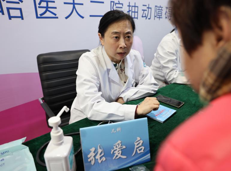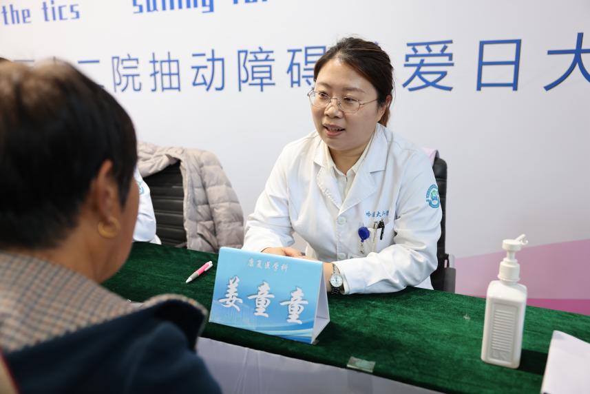 义诊现场气氛热烈且秩序井然,儿内科张爱启主任医师耐心为抽动障碍儿童进行检查,细致讲解病情并分析病因,提供诊疗方案,有效缓解了家长的焦虑情绪。针对抽动障碍常合并睡眠问题的特点,癫痫及睡眠障碍中心朱延梅主任医师及陈岩主治医师为相关患儿家属开展诊治咨询,并科普经颅磁刺激治疗。对于以身体疼痛、颈部不适为主要表现的患儿,骨科夏景君主任医师凭借丰富临床经验答疑解惑,还现场科普了发育中儿童的正确书写姿势。眼科孙静波主任医师对眼部抽动症状患儿进行诊疗,逐一解答家长的疑问。康复医学科姜童童针对患儿情况,给出康复训练建议,演示实操动作,帮助患儿改善功能。儿内科付姝丽护士长为家长讲解抽动障碍治疗中的科学护理与管理要点。眼科刘双、儿内科罗翕允、高可馨、陈可欣、胡子荣医师开展免费测评和检测工作,保障义诊活动顺利推进。