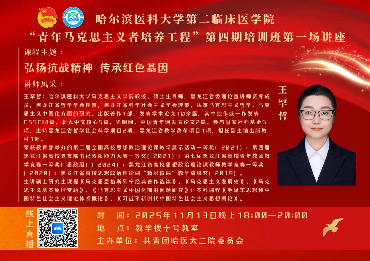 马克思主义学院教授王罕哲老师担任“青年马克思主义者培养工程”第四期培训班开班式首讲嘉宾,为全体青马学员作了题为《弘扬抗战精神 传承红色基因》的专题讲座。王罕哲老师从铭记历史,回顾抗战艰苦历程;感悟力量,弘扬伟大抗战精神;吾辈自强,勇担时代复兴使命三个方面对抗战那段光辉岁月进行了解读。教导学员们当以厚重的历史为教科书,深刻领悟那段烽火连天的抗战岁月。从卢沟桥畔打响全面抗战的第一枪,到平型关下粉碎日军不可战胜的神话,再到百团大战中破袭交通、重创敌寇的壮举,无数英烈以血肉之躯筑起了保卫民族独立与尊严的长城。这场伟大斗争所淬炼出的抗战精神——天下兴亡、匹夫有责的爱国情怀,视死如归、宁死不屈的民族气节,不畏强暴、血战到底的英雄气概,百折不挠、坚忍不拔的必胜信念,是中华民族宝贵的精神财富,必须由一代代青年传承下去。习近平总书记曾深切寄语青年:“青春由磨砺而出彩,人生因奋斗而升华。” 站在新的历史起点,要弘扬抗战精神,就是要铭记历史苦难,从中汲取前行的力量,要将爱国情、强国志、报国行自觉融入个人追求,在科学探索中勇攀高峰,在基层实践中服务人民,在时代浪潮中挺立潮头。要牢记总书记“立大志、明大德、成大才、担大任”的殷切期望,将个人奋斗的“小目标”融入国家发展的“大蓝图”,不畏艰难险阻,练就过硬本领,在实现中华民族伟大复兴的新征程上,跑好属于新时代青年的奋斗接力,用行动证明新时代中国青年堪当民族复兴重任。